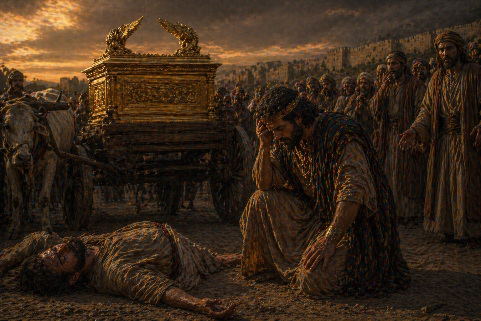 다윗은 분노했고, 두려워했고, 언약궤를 예루살렘에 들이지 못했다. 하나님의 경고가 다윗에게도 실질적으로 적용된 것이다 — 직접적 죽음이 아니라, 언약궤를 갖지 못하는 상실로.