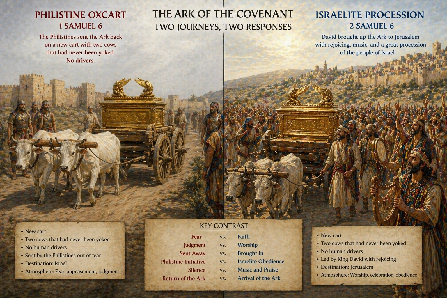 언약궤가 수레에 실려 운반된 선례가 있었다. 그것은 사무엘상 6장에 나온다. 블레셋이 언약궤를 돌려보낼 때, 그들은 새 수레를 만들고 젖 나는 암소 두 마리에 언약궤를 실어 이스라엘로 돌려보냈다.