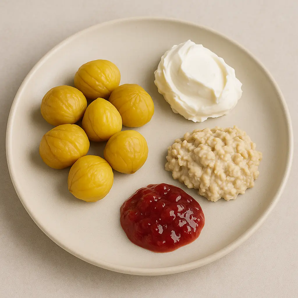 👉 진공포장 찐 밤은 껍질 벗기기 쉬운 걸로 고르고, 크림치즈는 플레인으로 시작해보세요. 오트밀 잼은 당분 낮은 제품이나 직접 만들어도 좋아요!
