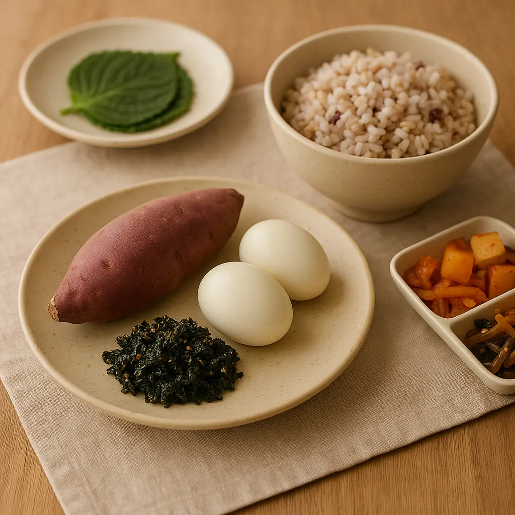 🍴 찐고구마에 삶은계란, 김자반을 더한 포근한 한 끼! 요리 없이도 부드럽고 든든하게, 마음 허한 날 속을 따뜻하게 채워보세요.