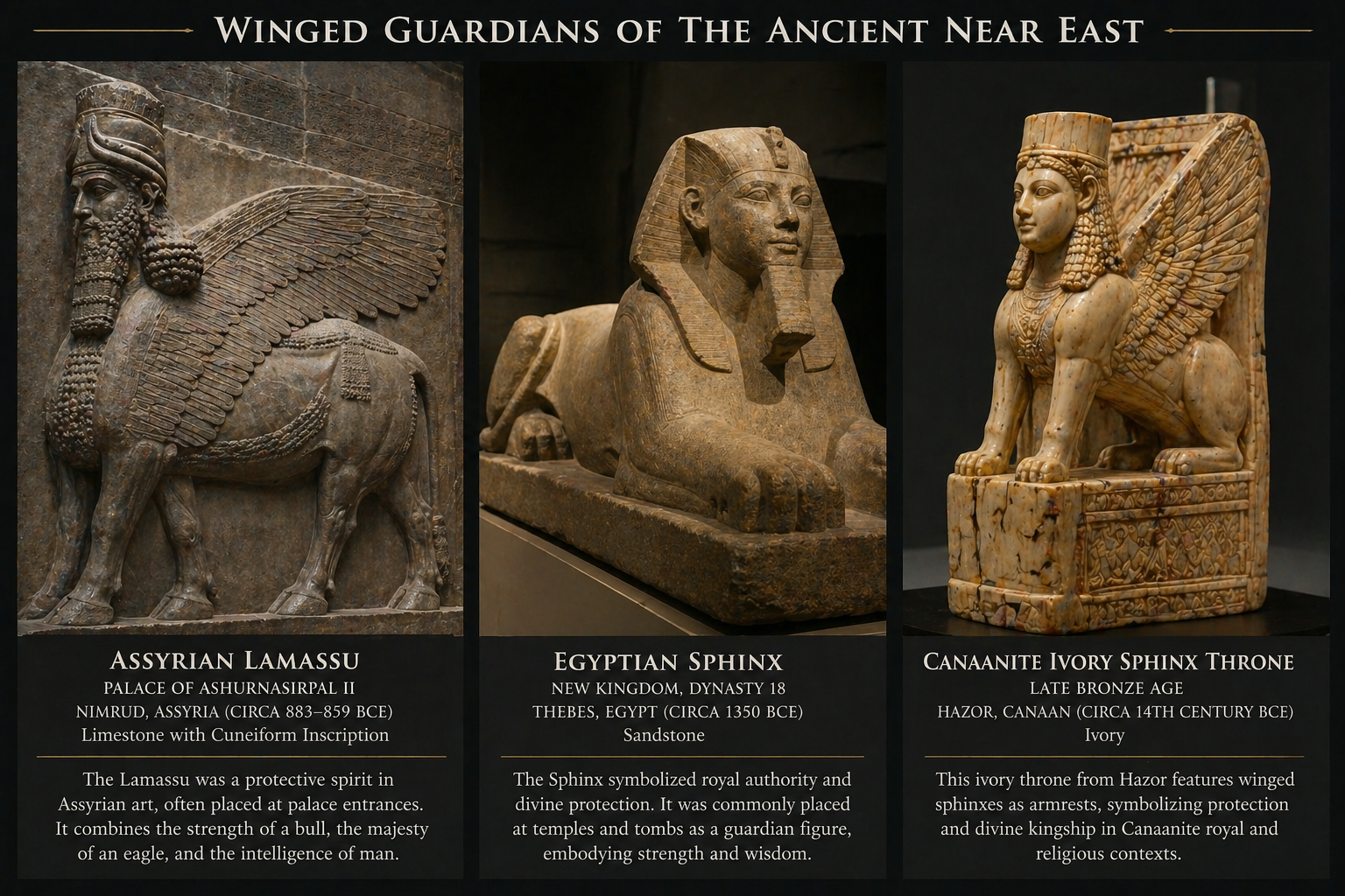 고고학은 흥미로운 사실을 제시한다. **라마수(Lamassu)**는 아시리아의 수호 신수로, 사람 얼굴, 소 몸통, 독수리 날개를 가진 복합 생명체다. 이집트의 스핑크스도 유사한 복합 구조를 가진다. 가나안 지역의 왕좌에는 종종 날개 달린 스핑크스들이 옆에서 왕좌를 지지하는 형상이 새겨져 있었다.