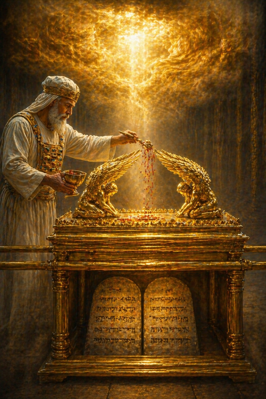 이것은 무엇을 의미하는가? 하나님의 계명(십계명 돌판)이 궤 안에 있다. 인간은 그 계명을 어겼다. 그 계명 위에 희생 제물의 피가 뿌려진다. 계명과 하나님 사이, 그 접촉점에서 피가 죄를 덮는다.