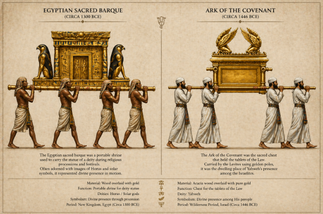 - 운반 방식의 차이: 이집트의 신성한 배는 사제들이 어깨에 메고 운반했지만, 자격 없는 자가 만지면 어떻게 되는지에 대한 개념이 달랐다. 이스라엘의 언약궤는 레위인 중에서도 특정 지파만 운반할 수 있었고, 만지는 것 자체가 죽음을 불러올 수 있었다.