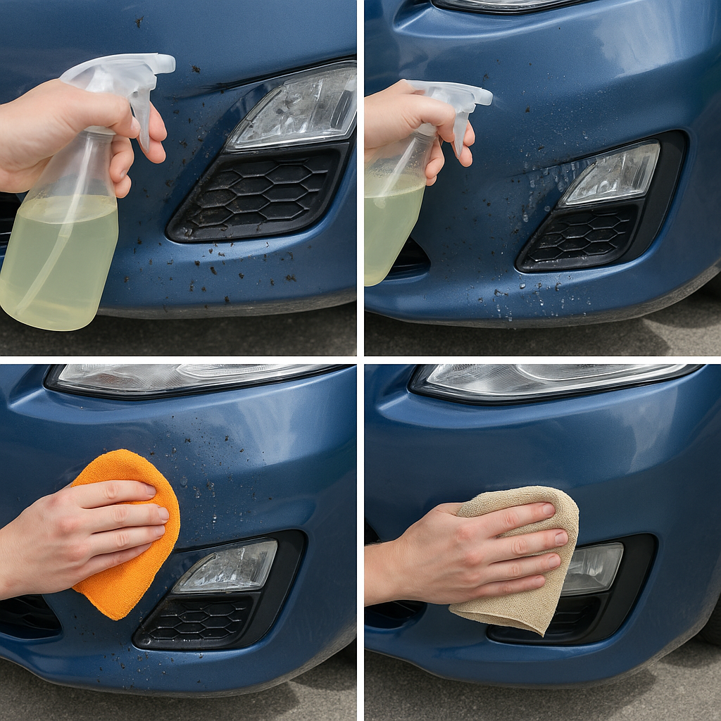 자동차 외부 식초+미온수 스프레이 후 부드럽게 제거 왁스 코팅 추천 실내 제거 청소기 + 아로마 오일 퇴치제 틈새 차단 중요 예방 세차 후 왁스, 주차 시 창문 닫기 주행 중 붙은 즉시 닦기 - 📌 실내 유입 원인: