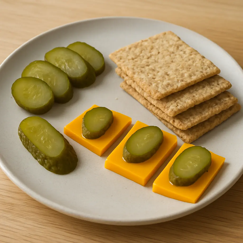 입맛 없을 때, 별거 아닌 조합이 오히려 위로가 되죠. 짭짤한 치즈, 상큼한 피클, 바삭한 크래커.