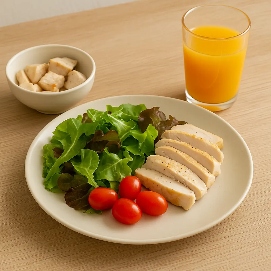 🥗 샐러드팩에 닭가슴살과 오렌지주스를 더한 균형 잡힌 한 끼! 요리 없이도 산뜻하고 상큼하게, 가볍지만 든든한 건강 루틴을 완성해보세요.