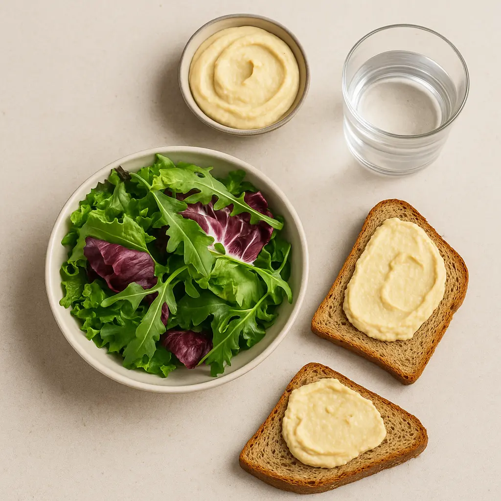 🥗 비건샐러드에 고소한 후무스와 통밀빵을 곁들인 한 접시! 요리 없이도 균형 잡힌 영양과 포만감을 자연스럽게 채워보세요.