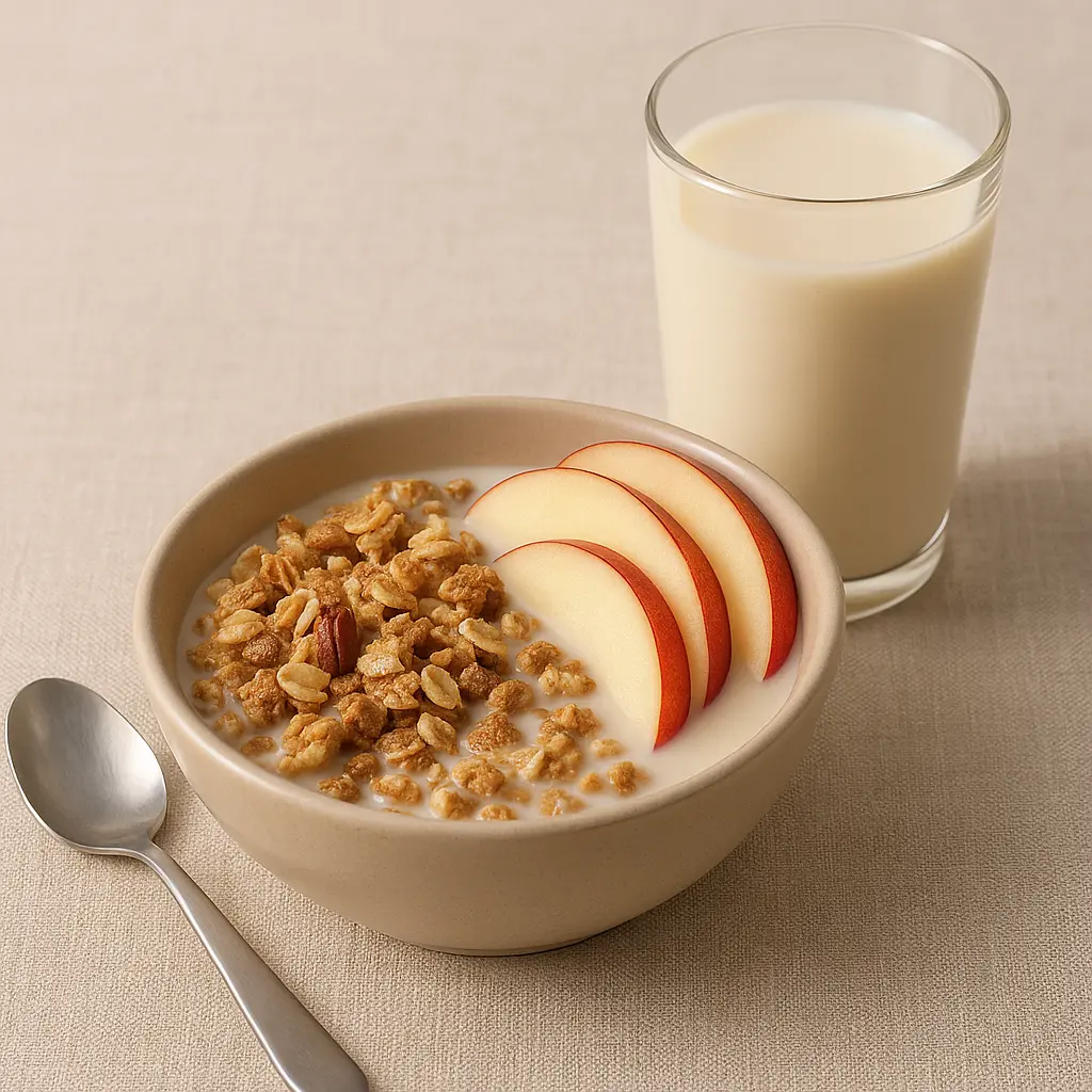 🥄 부드러운 두유, 바삭한 그래놀라, 아삭한 사과 슬라이스가 어우러진 요리 없는 아침식사 한 그릇. 속 편하고 든든하게 하루를 시작해보세요.