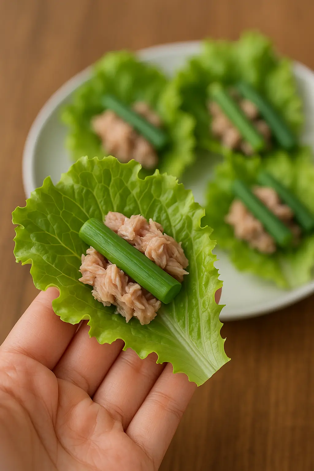 상추 위에 참치 한 숟갈, 마늘쫑 몇 조각만 올려보세요